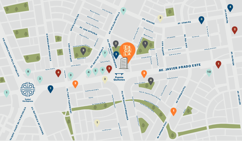 Servicios y hoteles - Metropolitano, Hotel Westin, Sodimac Javier Prado, Reniec San isidro, Movil Bus, Cruz del Sur, Civa, Scotiabank, Interbank, Metro Canadá, Wong San Borja, Plaza Vea San Borja.