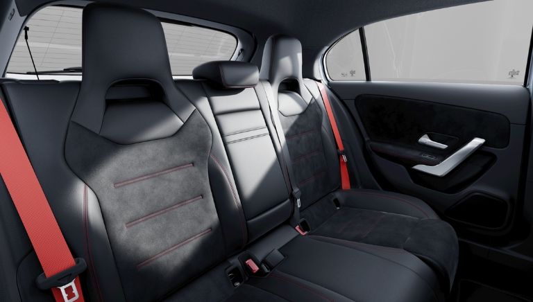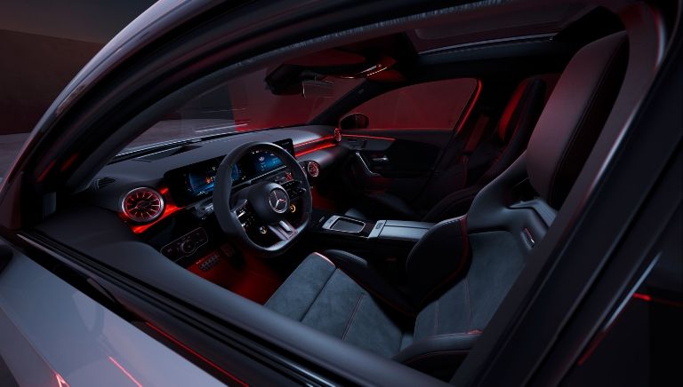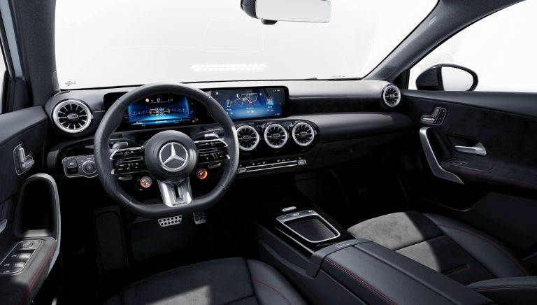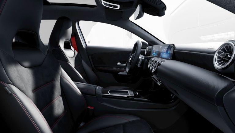 El habitáculo del Mercedes-AMG Clase A llama poderosamente la atención con el sistema multimedia MBUX de ultima generación. Se maneja un concepto de manejo intuitivo donde se fusionan dos visualizadores de 10.25" cada uno, para conformar el puesto de conducción widescreen. Otra novedad es la iluminación de ambiente de 64 colores, el acceso confort KEYLESS-GO y los asientos deportivos con ajustes eléctricos y función de memoria.